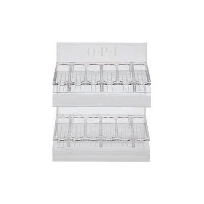 Acrylic display features 2 shelves with 6 slots per shelf, holding 3 bottles deep of each shade for a total of 36 bottles of OPI Nail Lacquer.