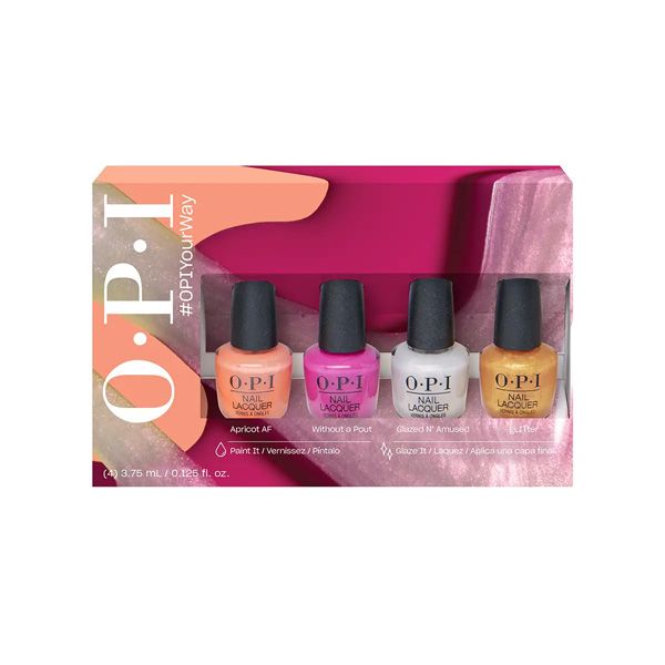 Mini Pack: 4 mini OPI Your Way Nail Lacquer shades: Apricot AF, Without a Pout, Glazed N’ Amused, and gLITer